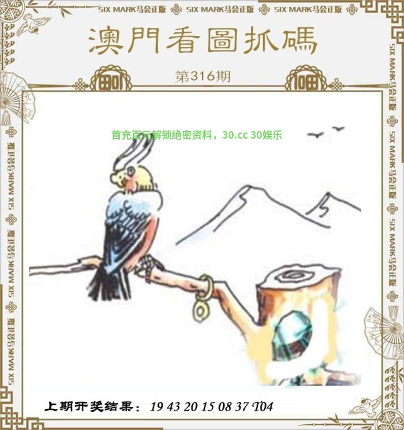 【妙解看图抓码】316期:图中有一只鹦鹉栖息在树枝上,树枝上挂着一个环形物体。 背景有山脉和两只飞翔的鸟。 树桩底部有一个发光的物体。